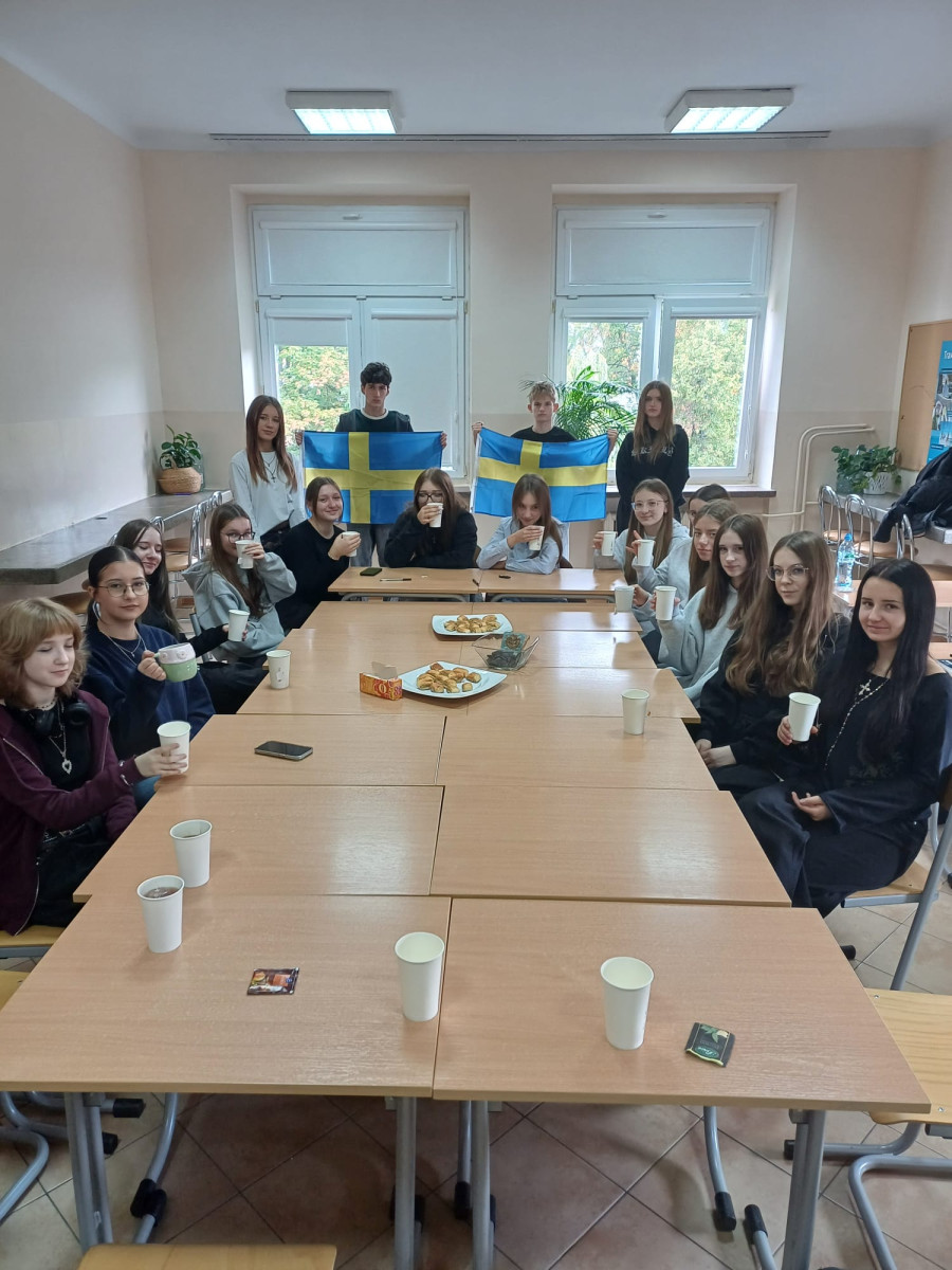Uczniowie klasy 1B1 uczestniczyli w wyjątkowej lekcji kulturowo-językowej poświęconej tradycji fika. W Szwecji to szczególny moment w ciągu dnia, kiedy bliscy, przyjaciele czy współpracownicy spotykają się, by wspólnie napić się kawy lub herbaty i zjeść coś słodkiego. Fika to nie tylko przerwa na posiłek – to ważny element kultury, podkreślający wartość relacji i odpoczynku. Na zajęciach uczniowie mieli okazję spróbować szwedzkich smakołyków, które zostały przysłane przez nauczycieli i uczniów ze szkoły w Szwecji. Gościli oni w naszej szkole w maju 2025 roku i planują ponownie nas odwiedzić w 2026 r. Na naszych stołach pojawiły się między innymi pyszne cynamonki oraz charakterystyczne cukierki o smaku lukrecji.