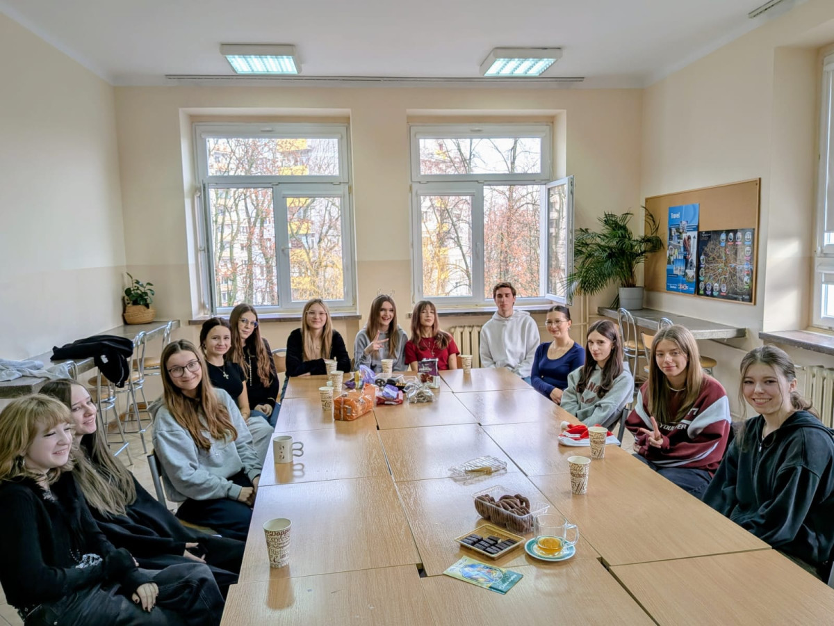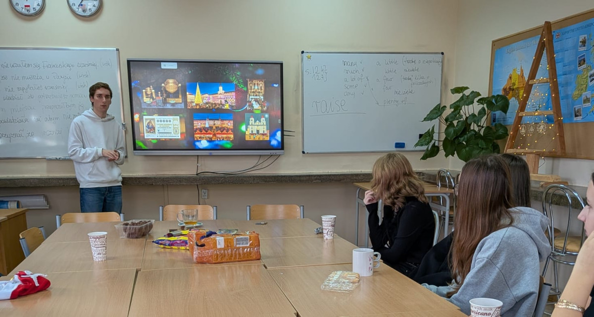 Nasz gość z kolei z ciekawością poznawał polskie zwyczaje: łamanie się opłatkiem, obdarowywanie się prezentami na Mikołajki i Gwiazdkę. Uczestnicy skosztowali "prawie domowych" pierników, było dużo uśmiechu, nowych doświadczeń i kulturowych ciekawostek. Aromatyczna zimowa herbata dopełniła całości. To właśnie takie wydarzenia sprawiają, że nauka języków obcych staje się prawdziwą przygodą! Spotkanie przygotowane we współpracy z SODMiDN Kielce, SP 20 i RCW w Kielcach.