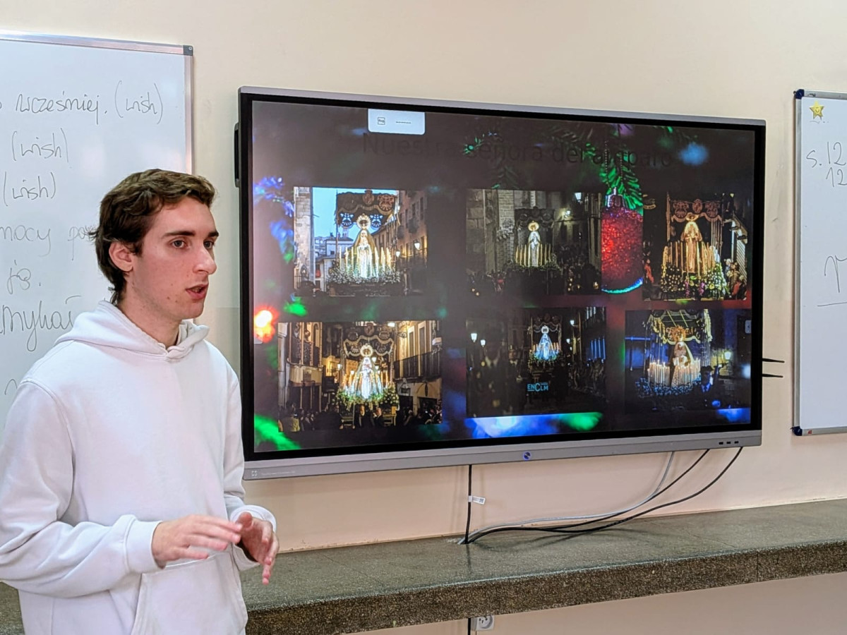 W ramach cyklu językowo-kulturoznawczego „Christmas Around the World”, promującego tradycje bożonarodzeniowe różnych krajów, 10 grudnia w Zespole Szkół nr 3 odbyło się wyjątkowe spotkanie poświęcone Hiszpanii. Naszym gościem był Tomás Lozano, który z ogromną pasją opowiedział uczniom klas 3n, 2b oraz 1b1 o tym, jak wyglądają święta na Półwyspie Iberyjskim.