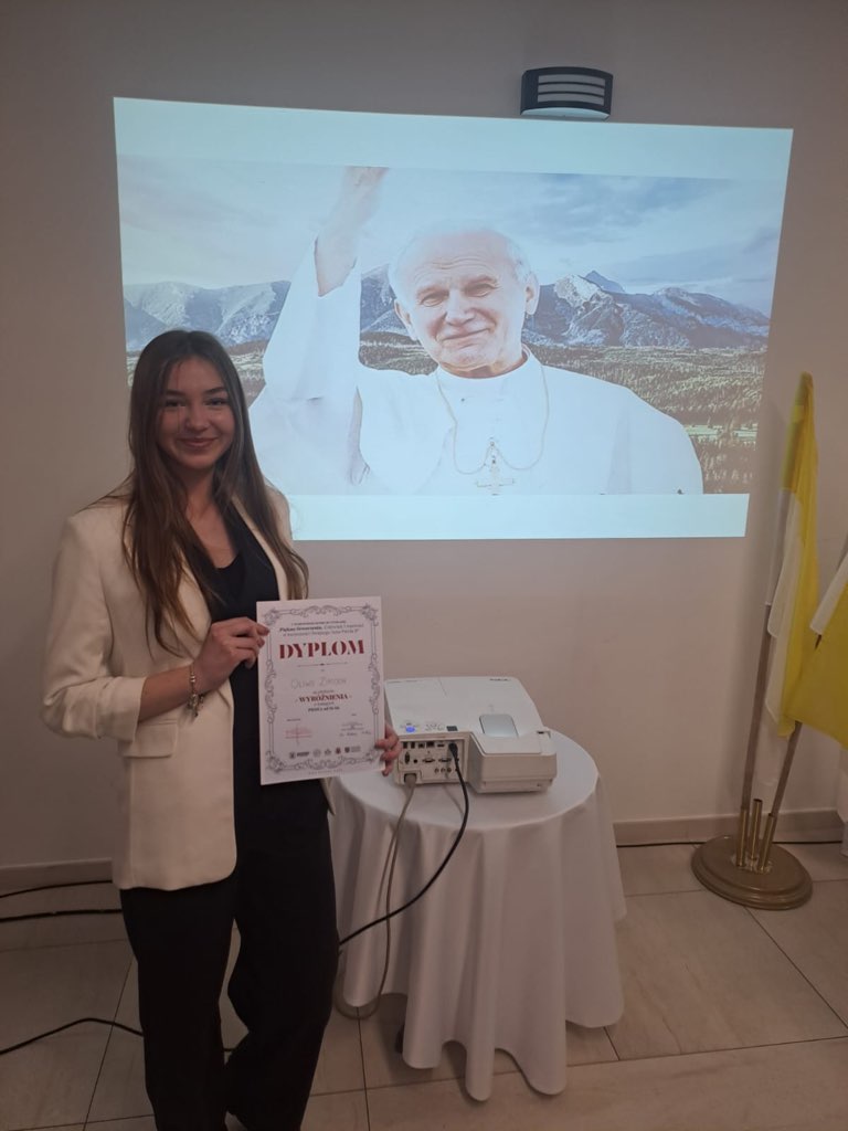 Uczennica klasy 4g Oliwia Zimoch wzięła udział w jubileuszowej, V edycji Wojewódzkiego Konkursu Literackiego „Piękno stworzenia. Człowiek i wartości w twórczości Świętego Jana Pawła II".