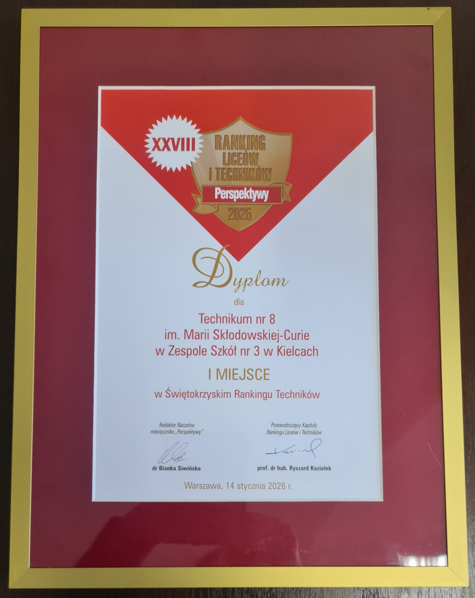 Nasze Technikum nr 8 im. Marii Skłodowskiej-Curie zajęło 1 Miejsce w Świętokrzyskim Rankingu Techników zdobywając po raz kolejny złotą odznakę Perspektyw.