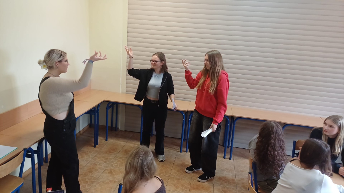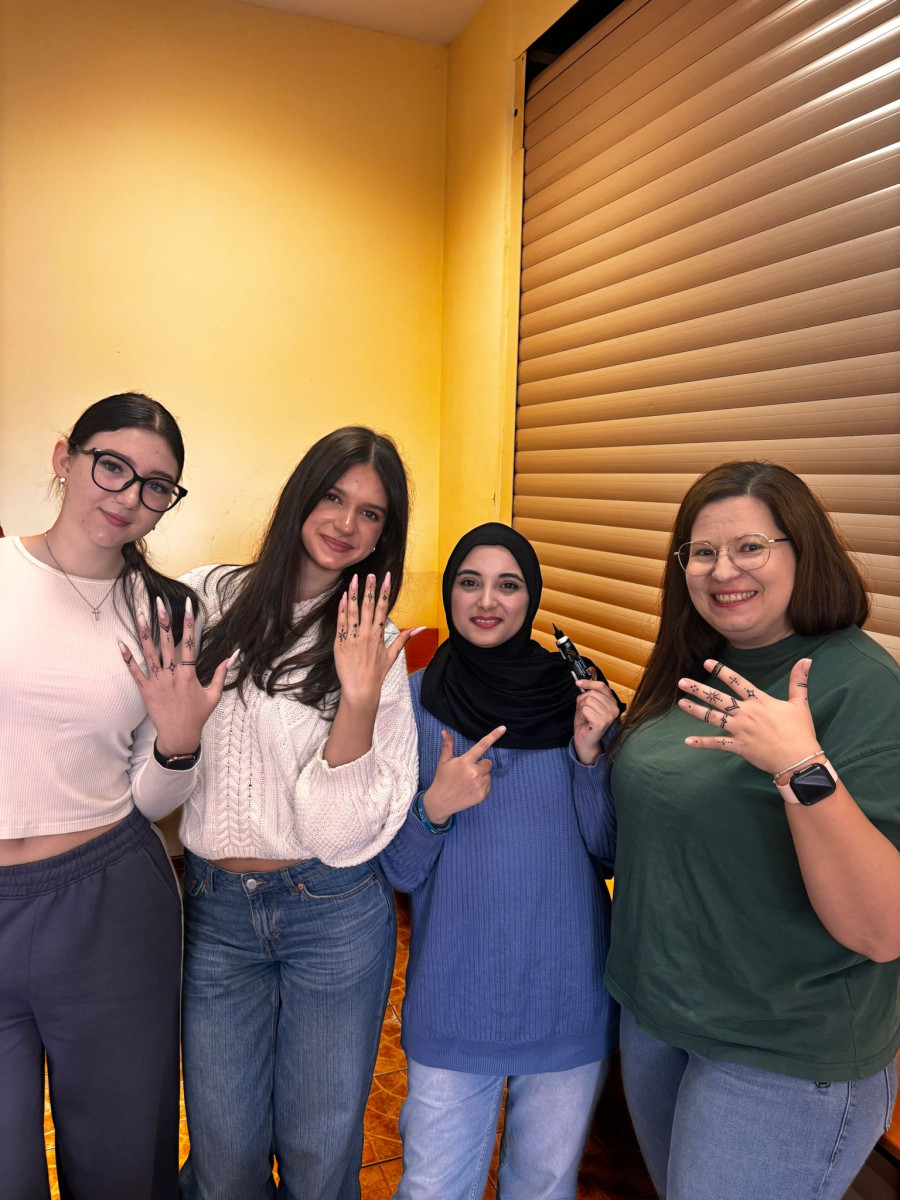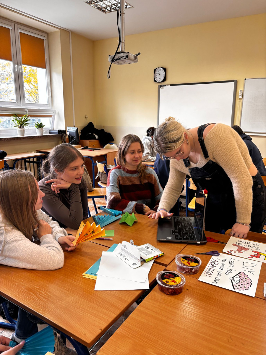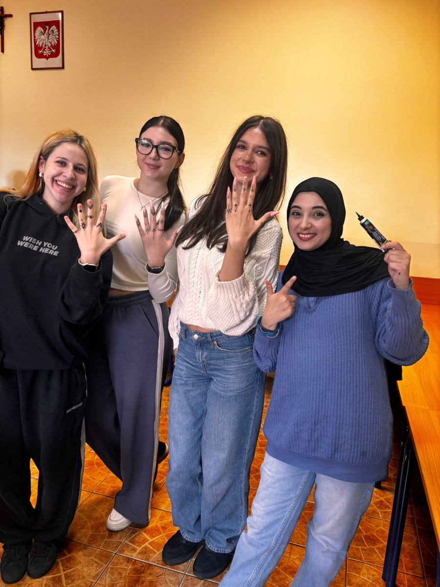 W dniu 17.10.2025r. w naszej szkole obchodziliśmy Dni Erasmusa z Europejskimi Wolontariuszami, zorganizowanymi przez Regionalne Centrum Wolontariatu. Ten dzień uczniowie mieli okazję spędzić z Simone z Portugalii, Afri z Hiszpanii oraz z Hellen z Jordanu. Opowiadali o swoich krajach, geografii, historii i kulturze. Uczyli się podstawowych kroków flamenco. Rozmawiali po angielsku. Zapoznawali się z wolontariuszami, którzy spędzą w Kielcach wiele miesięcy. Niektórzy wyszli z pięknymi tatuażami z henny wykonanymi przez Hellen. To był czas pełen inspiracji, kulturowej wymiany i pozytywnej energii.